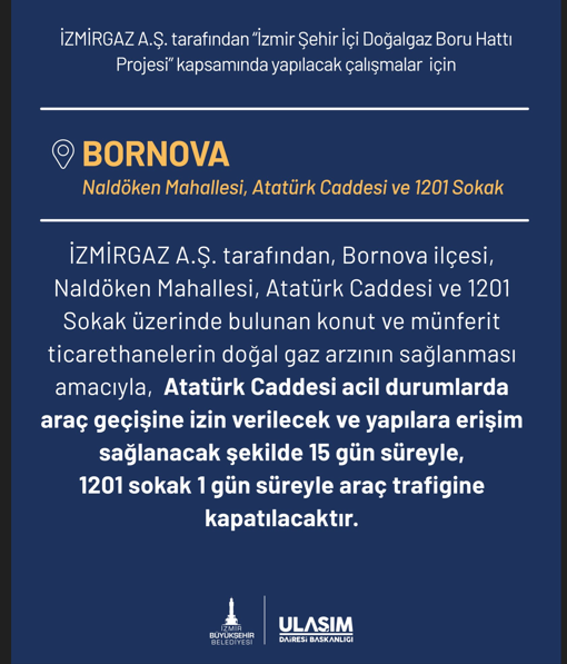 “İZMİRGAZ A.Ş. tarafından "İzmir Şehir İçi Doğalgaz Boru Hatti Projesi" kapsamında yapılacak çalışmalar için BORNOVA’NIN Naldöken Mahallesi, Atatürk Caddesi ve 1201 Sokak’ta trafiğe yönelilk düzenleme yapılacak.İZMİRGAZ A.Ş. tarafından, Bornova ilçesi, Naldöken Mahallesi, Atatürk Caddesi ve 1201 Sokak üzerinde bulunan konut ve münferit ticarethanelerin doğal gaz arzının sağlanması amacıyla, Atatürk Caddesi acil durumlarda araç geçişine izin verilecek ve yapılara erişim sağlanacak şekilde 15 gün süreyle, 1201 sokak 1 gün süreyle araç trafigine kapatılacaktır.”