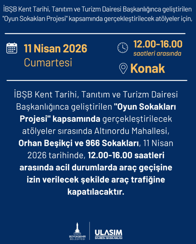 “İBŞB Kent Tarihi, Tanıtım ve Turizm Dairesi Başkanlığınca geliştirilen "Oyun Sokakları Projesi" kapsamında gerçekleştirilecek atölyeler sırasında Altınordu Mahallesi, Orhan Beşikçi ve 966 Sokakları, 11 Nisan 2026 tarihinde, 12.00-16.00 saatleri arasında acil durumlarda araç geçişine izin verilecek şekilde araç trafiğine kapatılacaktır.”