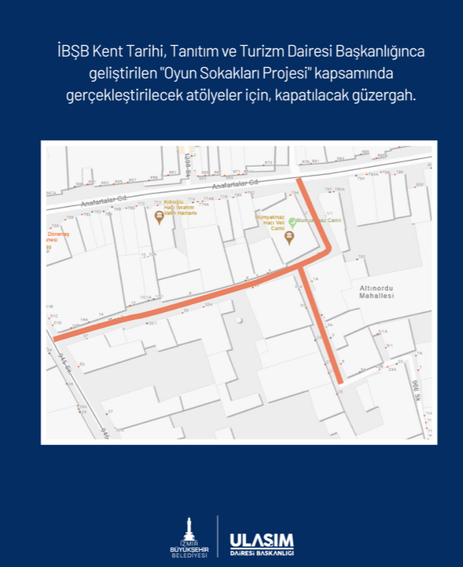 İzmir Büyükşehir Belediyesi Yol Yapım, Bakım ve Onarım Dairesi Başkanlığı tarafından yapılan açıklamada Kent Tarihi, Tanıtım ve Turizm Dairesi Başkanlığı tarafından geliştirilen “Oyun Sokakları Projesi” kapsamında yeni bir uygulamaya gidildiği bildirildi. Gerçekleştirilen açıklamaya göre Altınordu Mahallesi sınırlarında yer alan Orhan Beşikçi ve 966 Sokaklar yarın proje kapsamında gerçekleştirilecek atölyeler nedeniyle geçici süreyle araç trafiğine kapatılacak.
