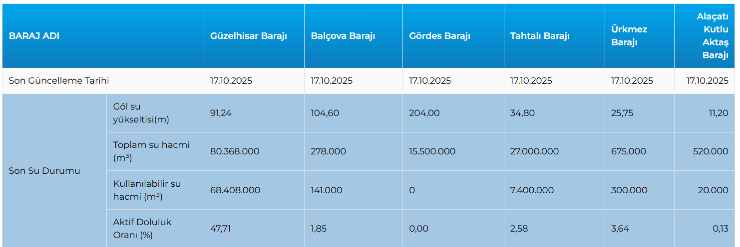 Kuraklık ve yüksek sıcaklıklar nedeniyle İzmir’deki barajlardaki doluluk oranları alarm veriyor. Tahtalı Barajı’nda doluluk oranı yüzde 2,58’e, Ürkmez Barajı’nda yüzde 3,64’e, Güzelhisar Barajı’nda ise yüzde 47,71’e kadar düştü. Balçova Barajı’nın da kurumasıyla, İzmir’in içme suyu temininde ciddi risk oluştu.