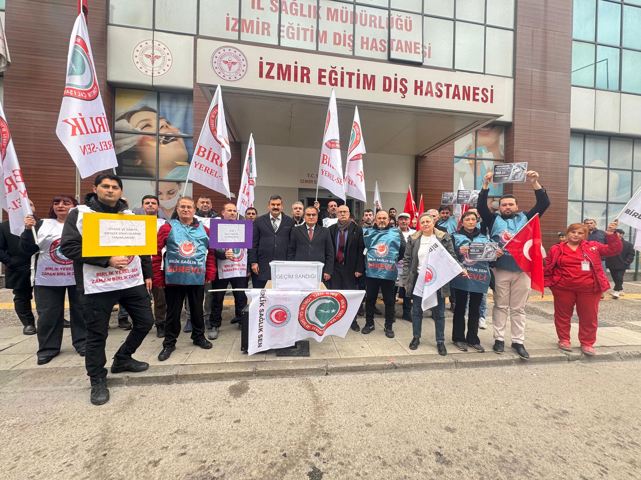 İzmir'de Birlik Sağlık-Sen ve Bağımsız Kamu Görevlileri Sendikaları Konfederasyonu'na (BASK) bağlı sendikalar, maaş zamlarını İzmir Eğitim Diş Hastanesi önünde protesto etti. Hastane önünde “Geçim Sandığı” kuran emekçiler, maaş bordrolarını sembolik olarak sandığa attı.