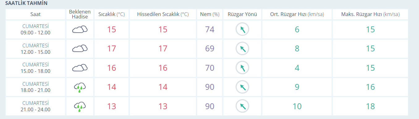 Meteoroloji’nin son tahminlerine göre İzmir genelinde ilçelerde parçalı ve çok bulutlu hava ile birlikte aralıklı sağanak yağış bekleniyor. Meteoroloji’nin son tahminlerine göre İzmir ilçelerinde öngörülen sıcaklık değerleri şöyle: İzmir 17°C parçalı ve çok bulutlu aralıklı sağanak yağışlı, Aliağa 17°C parçalı ve çok bulutlu aralıklı sağanak yağışlı, Balçova 18°C parçalı ve çok bulutlu aralıklı sağanak yağışlı, Bayındır 18°C parçalı ve çok bulutlu aralıklı sağanak yağışlı, Bayraklı 17°C parçalı ve çok bulutlu aralıklı sağanak yağışlı, Bergama 16°C parçalı ve çok bulutlu aralıklı sağanak yağışlı, Beydağ 18°C parçalı ve çok bulutlu aralıklı sağanak yağışlı, Bornova 18°C parçalı ve çok bulutlu aralıklı sağanak yağışlı, Buca 16°C parçalı ve çok bulutlu aralıklı sağanak yağışlı, Çeşme 17°C parçalı ve çok bulutlu aralıklı sağanak yağışlı, Çiğli 17°C parçalı ve çok bulutlu aralıklı sağanak yağışlı, Dikili 15°C parçalı ve çok bulutlu aralıklı sağanak yağışlı, Foça 16°C parçalı ve çok bulutlu aralıklı sağanak yağışlı, Gaziemir 16°C parçalı ve çok bulutlu aralıklı sağanak yağışlı, Güzelbahçe 17°C parçalı ve çok bulutlu aralıklı sağanak yağışlı, Karabağlar 17°C parçalı ve çok bulutlu aralıklı sağanak yağışlı, Karaburun 14°C parçalı ve çok bulutlu aralıklı sağanak yağışlı, Karşıyaka 17°C parçalı ve çok bulutlu aralıklı sağanak yağışlı, Kemalpaşa 16°C parçalı ve çok bulutlu aralıklı sağanak yağışlı, Kınık 16°C parçalı ve çok bulutlu aralıklı sağanak yağışlı, Kiraz 16°C parçalı ve çok bulutlu aralıklı sağanak yağışlı, Konak 17°C parçalı ve çok bulutlu aralıklı sağanak yağışlı, Menderes 16°C parçalı ve çok bulutlu aralıklı sağanak yağışlı, Menemen 17°C parçalı ve çok bulutlu aralıklı sağanak yağışlı, Narlıdere 16°C parçalı ve çok bulutlu aralıklı sağanak yağışlı, Ödemiş 18°C parçalı ve çok bulutlu aralıklı sağanak yağışlı, Seferihisar 18°C parçalı ve çok bulutlu aralıklı sağanak yağışlı, Selçuk 19°C parçalı ve çok bulutlu aralıklı sağanak yağışlı, Tire 18°C parçalı ve çok bulutlu aralıklı sağanak yağışlı, Torbalı 17°C parçalı ve çok bulutlu aralıklı sağanak yağışlı, Urla 17°C parçalı ve çok bulutlu aralıklı sağanak yağışlı.
