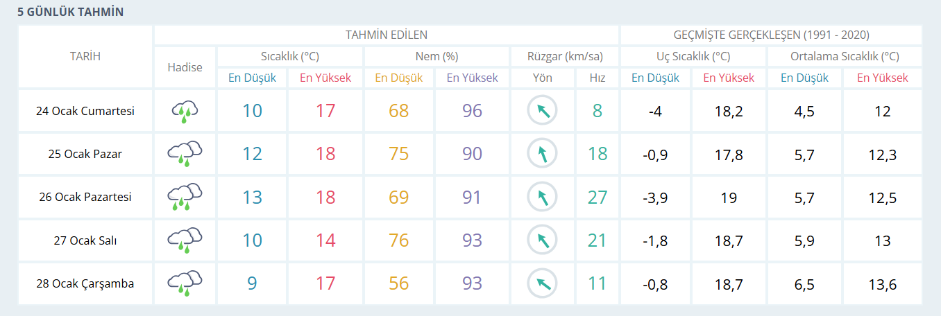 25 Ocak Pazar günü İzmir’de sıcaklığın 18 derece olması bekleniyor. 26 Ocak Pazartesi günü hava sıcaklığının yine 18 derece seviyelerinde olacağı tahmin ediliyor. 27 Ocak Salı günü sıcaklıkların 14 dereceye düşmesi beklenirken 28 Ocak Çarşamba günü ise sıcaklığın 17 dereceye çıkacağı öngörülüyor. Hafta boyunca sağanak yağışın devam etmesi bekleniyor.