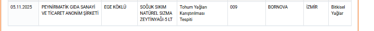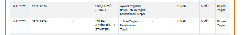 Tarım ve Orman Bakanlığı tarafından açıklanan güncel listede İzmir'in Konak ve Bornova ilçelerinde faaliyet gösteren 2 firmanın ürünleri yer aldı. Konak’ta üretim yapan NAZIF KAYA isimli firmaya ait AYÇİÇEK YAĞI (DÖKME) ürününde ayçiçek yağından başka tohum yağları karıştırıldığı tespit edildi.