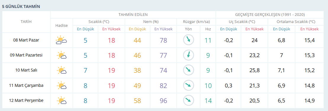 Meteoroloji Genel Müdürlüğü verilerine göre (bugün) 8 Mart 2026 tarihinde termometreler 18 dereceyi gösterecek. 9 Mart Pazartesi gün aynı şekilde 18 derecelik bir hava öngörülüyor. 10 Mart Salı günü ise sıcaklıklar 19 dereceye dayanacak. Aynı şekilde 11 Mart Çarşamba ve 12 Mart Perşembe günlerinde de termometrelerin 19 derecelerde seyretmesi bekleniyor. Hafta boyu İzmir'de yağış beklenmezken parçalı bulutlu bir hava öngörülüyor.