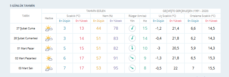 Meteoroloji Genel Müdürlüğü verilerine göre 27 Şubat Cuma günü İzmir genelinde hava parçalı bulutlu olacak ve sıcaklık 13 derece civarında seyredecek. Hafta sonu 28 Şubat Cumartesi günü de benzer şekilde parçalı bulutlu bir hava bekleniyor, sıcaklığın 14 derece olması öngörülüyor. 1 Mart Pazar günü ise parçalı bulutlu hava devam edecek ve sıcaklıkların 15 derece civarında olması bekleniyor.