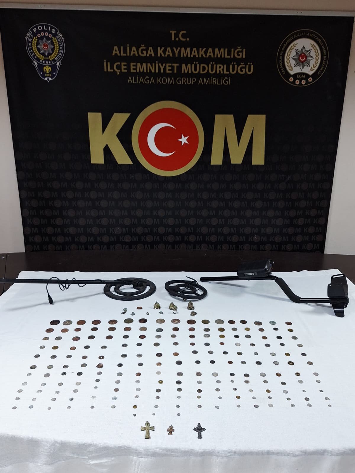Kınık'ta belirlenen adrese baskın düzenleyen ekipler, Roma, Helenistik ve Bizans dönemine ait olduğu değerlendirilen 190 sikke, 10 obje, 3 demir haç ve metal arama dedektörü ele geçirdi.