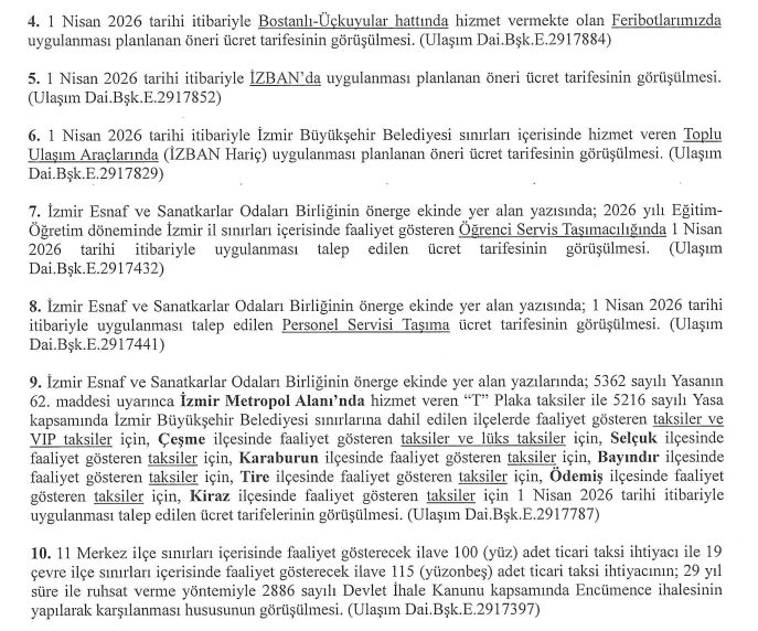 - 1 Nisan 2026 tarihi itibariyle İzmir Büyükşehir Belediyesi sınırları içerisinde hizmet veren Toplu Ulaşım Araçlarında (İZBAN Hariç) uygulanması planlanan öneri ücret tarifesinin görüşülmesi. (Ulaşım Dai.Bşk.E.2917829)