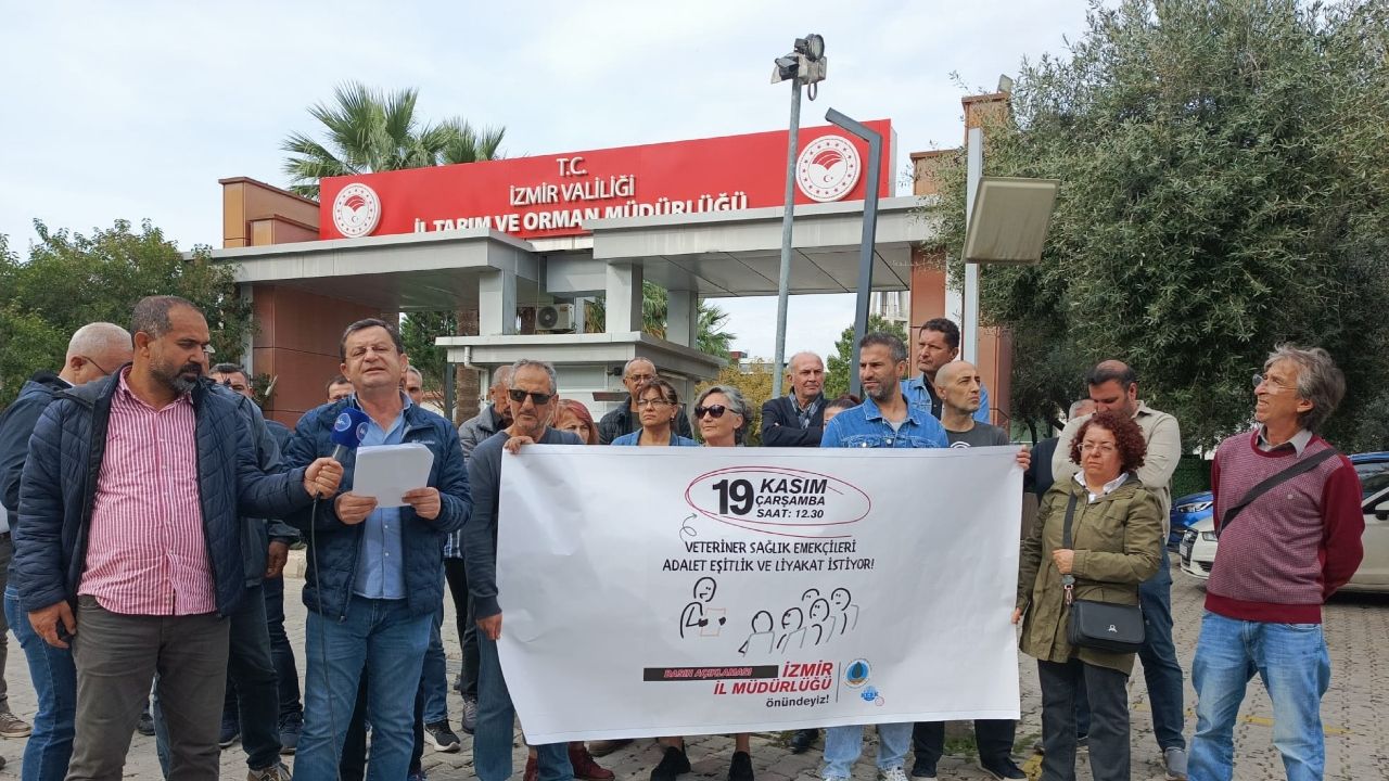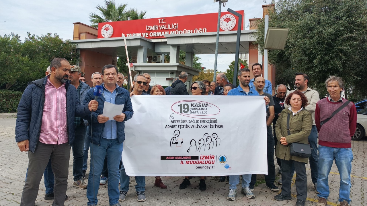 İzmir Tarım ve Orman İl Müdürlüğü önünde bir araya gelen veteriner sağlık emekçileri, hak ve çalışma koşullarına dair taleplerini tek tek açıkladı. Tarım Orkam Sen, tüm şubelerinde eş zamanlı gerçekleştirdiği basın açıklamasını İzmir Şubesi olarak İzmir Tarım ve Orman İl Müdürlüğü önünde yaptı. Açıklamayı Sendika İzmir Şubesi adına Şube Başkanı Ali Rıza Boz okudu.