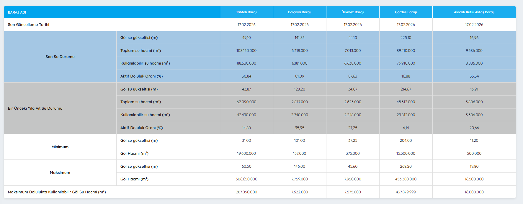 İzmir’de son haftalarda etkili olan sağanak yağışların ardından kenti besleyen barajlardaki doluluk oranlarında artış kaydedildi. 17 Şubat 2026 tarihli verilere göre birçok barajda hem toplam su hacmi hem de aktif doluluk oranı geçen yılın aynı dönemine göre yükseldi.