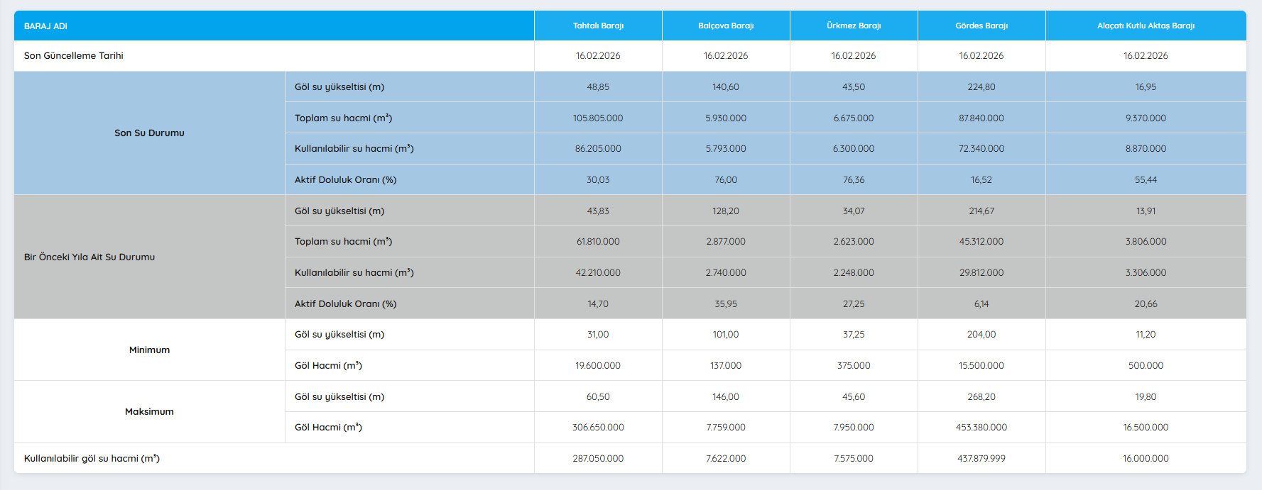 İzmir’in içme suyu ihtiyacını karşılayan barajlar, mevsim normallerinin altında kalan yağışlar nedeniyle uzun süredir baskı altındaydı. Son haftalarda etkili olan sağanak yağışlarla birlikte aktif su oranlarında artış gözlendi. Meteoroloji 2. Bölge verilerine göre 2026’nın ilk 44 gününde düşen yağış miktarı geçen yılın toplamını geride bıraktı. Yağışlar, kuraklık riskine karşı barajlara sınırlı da olsa katkı sundu.
