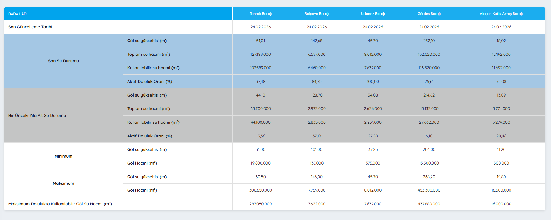 İzmir’de son haftalarda etkili olan yağışların ardından kenti besleyen barajların doluluk oranlarında yükseliş görüldü. 24 Şubat 2026 tarihli ölçümlere göre birçok barajda aktif doluluk oranının geçen yılın aynı dönemine göre arttığı kaydedildi. İşte İZSU tarafından paylaşılan güncel veriler...