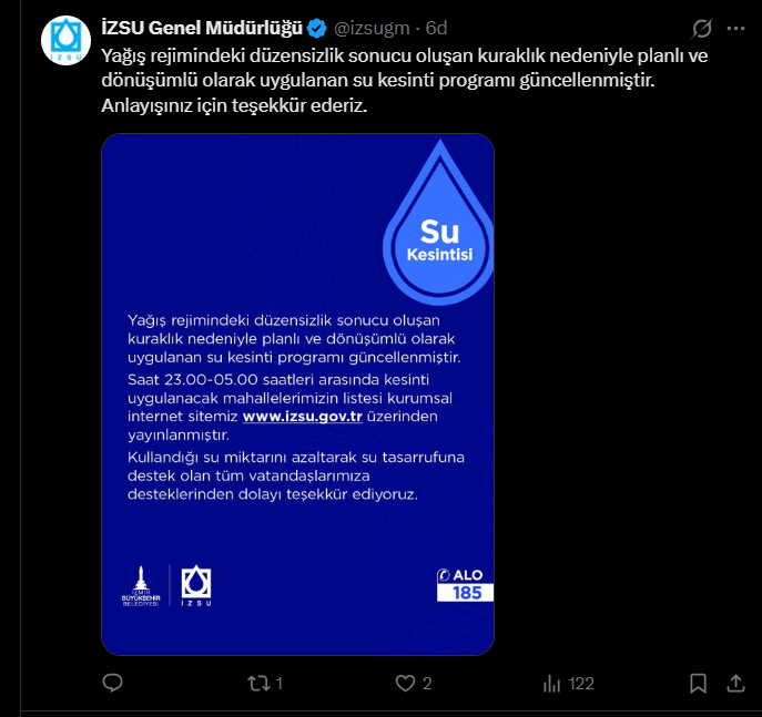 İzmir Su ve Kanalizasyon İdaresi (İZSU), yağışlardaki düzensizlik sonucu yaşanan kuraklığa bağlı olarak yürürlükte bulunan planlı ve dönüşümlü su kesintisi programında güncellemeye gitti. Aralık ayı boyunca uygulanması beklenen takvime göre birçok ilçede gece saatlerinde su kullanımı kesintiye uğrayacak.