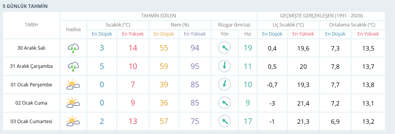 Meteoroloji Genel Müdürlüğü’nün tahminlere göre 30 Aralık Salı günü sağanak yağışlarla birlikte sıcaklık 14 dereceye kadar yükselecek. 31 Aralık yılbaşı gecesinde de yağışlı havanın etkisini sürdüreceği, sıcaklığın ise 10 derece civarında olacağı belirtildi. 1 Ocak Perşembe günü yağış beklenmezken hava sıcaklığının 7 dereceye kadar düşmesi öngörülüyor. 2 Ocak Cuma günü parçalı bulutlu bir havayla birlikte sıcaklıkların 9 derece civarında seyredeceği tahmin ediliyor. 1 ve 2 Ocak tarihlerinde en düşük sıcaklığın 0 derece olarak kaydedilmesi bekleniyor.