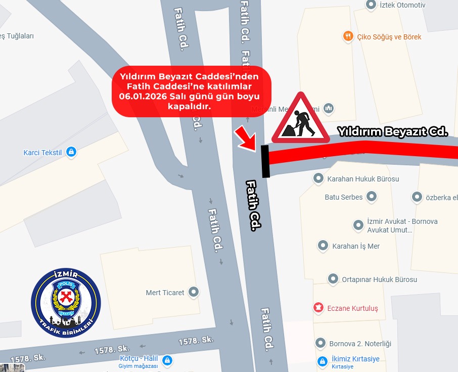 İzmir Emniyet Müdürlüğü tarafından yapılan duyuruda Yıldırım Beyazıt Caddesi’nden Fatih Caddesi’ne olan katılımların (bugün) 06.01.2026 Salı günü boyunca araç trafiğine kapalı olacağı belirtildi.