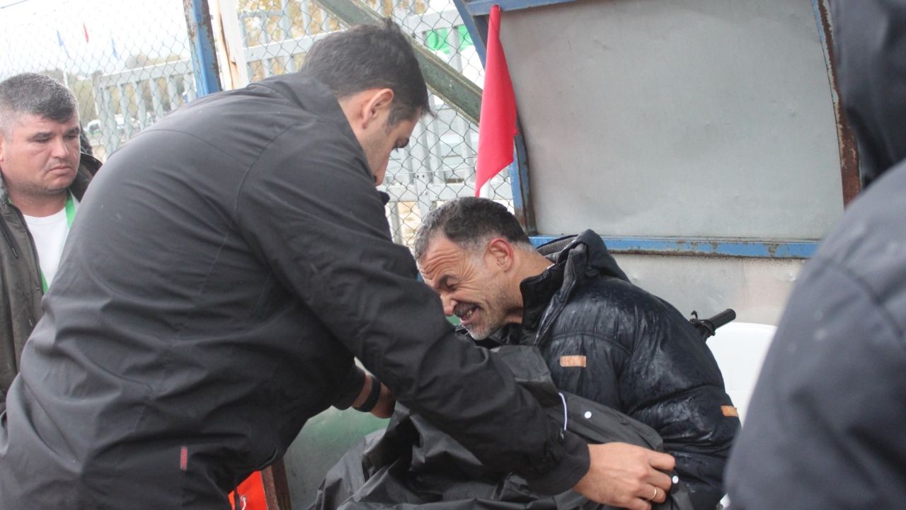 Maçı saha kenarındaki kulübeden izleyen Nevzat Kahyaoğlu (48) maç sırasında yağışın etkisini artırması üzerine ıslanmaya başladı.