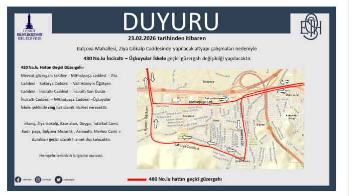 “23.02.2026 tarihinden itibaren Balçova Mahallesi, Ziya Gökalp Caddesinde yapılacak altyapı çalışmaları nedeniyle 480 No.lu İnciraltı - Üçkuyular İskele geçici güzergah değişikliği yapılacaktır.