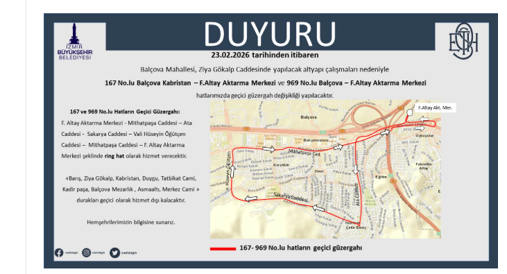 “23.02.2026 tarihinden itibaren Balçova Mahallesi, Ziya Gökalp Caddesinde yapılacak altyapı çalışmaları nedeniyle 167 No.lu Balçova Kabristan - F.Altay Aktarma Merkezi ve 969 No.lu Balçova - F.Altay Aktarma Merkezi hatlarımızda geçici güzergah değişikliği yapılacaktır. 167 ve 969 No.lu Hatlanın Geçici Güzergahi: F. Altay Aktarma Merkezi - Mithatpaşa Caddesi-Ata Caddesi-Sakarya Caddesi - Vali Hüseyin Öğütçen Caddesi - Mithatpaşa Caddesi - F. Altay Aktarma Merkezi şeklinde ring hat olarak hizmet verecektir. *Barış, Ziya Gökalp, Kabristan, Duygu, Tatbikat Cami, Kadir paşa, Balçova Mezarlık, Asmaalti, Merkez Cami durakları geçici olarak hizmet dışı kalacaktır.”