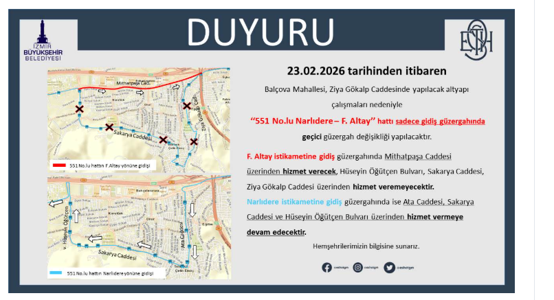 “23.02.2026 tarihinden itibaren Balçova Mahallesi, Ziya Gökalp Caddesinde yapılacak altyapı çalışmaları nedeniyle "551 No.lu Narlıdere - F. Altay" hattı sadece gidiş güzergahında geçici güzergah değişikliği yapılacaktır. F. Altay istikametine gidiş güzergahında Mithatpaşa Caddesi üzerinden hizmet verecek, Hüseyin Öğütçen Bulvarı, Sakarya Caddesi, Ziya Gökalp Caddesi üzerinden hizmet veremeyecektir.