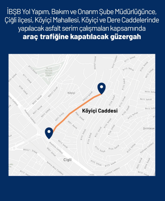İzmir Büyükşehir Belediyesi Yol Yapım, Bakım ve Onarım Şube Müdürlüğü tarafından yürütülecek çalışmalar kapsamında Çiğli ilçesi Köyiçi Mahallesi’nde Köyiçi ve Dere Caddelerinde asfalt serimi yapılacak. Bu kapsamda Köyiçi Caddesi, çalışma süresince araç trafiğine kapatılacak.