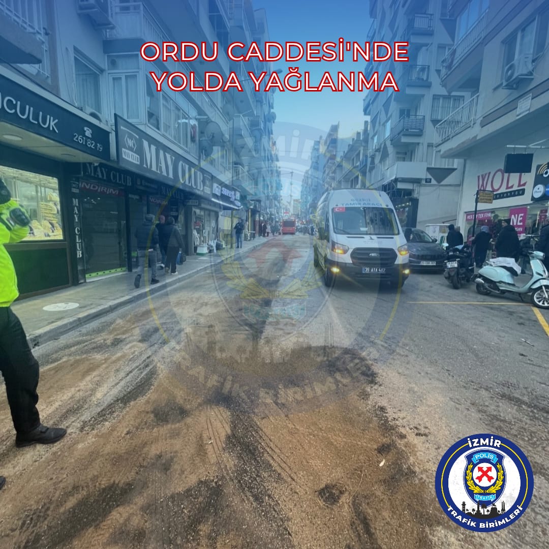 İzmir Emniyet Müdürlüğü’nün açıklamasının tamamı şu şekilde: “Karabağlar Ordu Caddesi yolun yoğun bir şekilde yağlanması nedeniyle yol geliş gidiş trafiğe kapanmıştır. Kumlama işlemleri bittikten sonra trafiğe açılacak olup güzergahı kullanacak olan sayın yol kullanıcılarımızın bilgisine sunulur.”