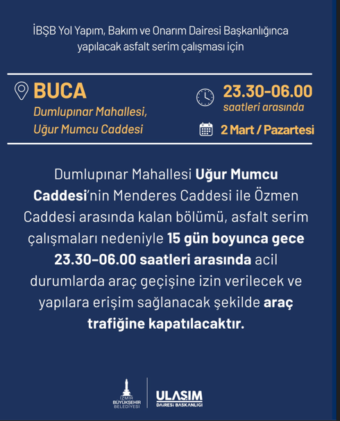 “İBŞB Yol Yapım, Bakım ve Onarım Dairesi Başkanlığınca yapılacak asfalt serim çalışması için BUCA’nın Dumlupınar Mahallesi, Uğur Mumcu Caddesi 23.30-06.00 saatleri arasında 2 Mart/Pazartesi gününden itibaren trafiğe yönelik düzenleme yapılacak. Dumlupınar Mahallesi Uğur Mumcu Caddesi'nin Menderes Caddesi ile Özmen Caddesi arasında kalan bölümü, asfalt serim çalışmaları nedeniyle 15 gün boyunca gece 23.30-06.00 saatleri arasında acil durumlarda araç geçişine izin verilecek ve yapılara erişim sağlanacak şekilde araç trafiğine kapatılacaktır.” İşte İZMİRGAZ A.Ş. tarafından "İzmir Şehir İçi Doğalgaz Boru Hattı Projesi" kapsamında yapılacak çalışmalar için kapatılacak güzergahlar: