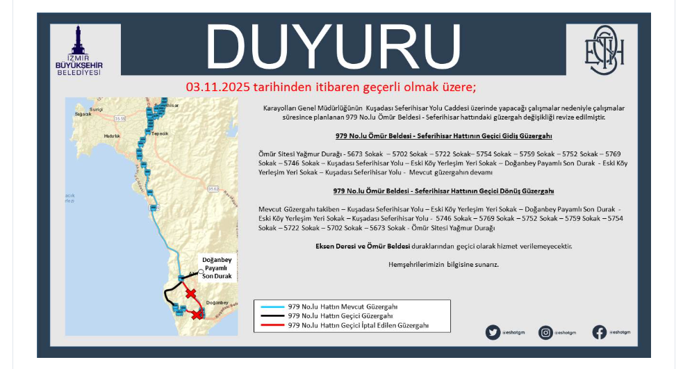 ESHOT, aynı hattın geçici dönüş güzergahında da değişiklik yapıldığını duyurdu. 979 No’lu Ömür Beldesi - Seferihisar hattının yeni dönüş güzergahı Mevcut güzergahı takiben - Kuşadası Seferihisar Yolu - Eski Köy Yerleşim Yeri Sokak - Doğanbey Payamlı Son Durak - Eski Köy Yerleşim Yeri Sokak - Kuşadası Seferihisar Yolu - 5746 Sokak - 5769 Sokak - 5752 Sokak - 5759 Sokak - 5754 Sokak - 5722 Sokak - 5702 Sokak - 5673 Sokak - Ömür Sitesi Yağmur Durağı şeklinde olacak.