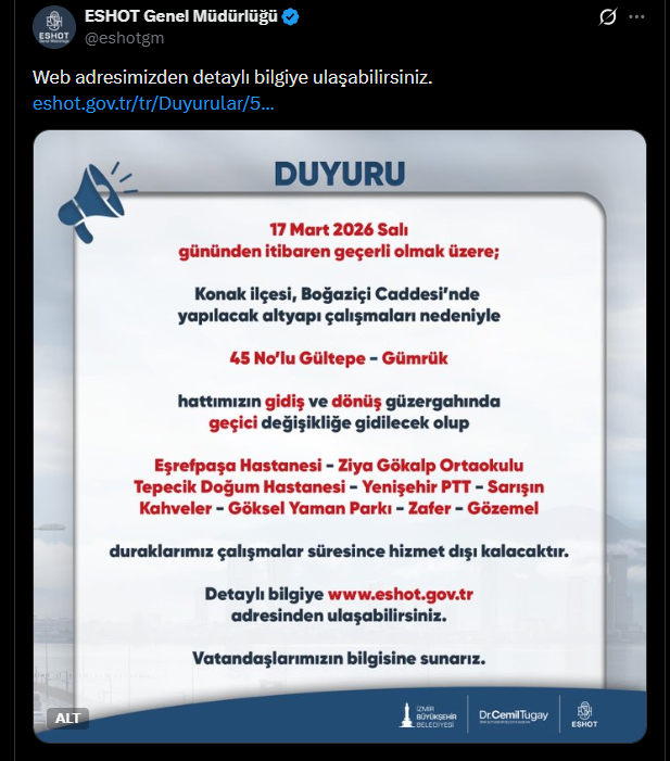 “17 Mart 2026 Salı gününden itibaren geçerli olmak üzere; Konak ilçesi, Boğaziçi Caddesi'nde yapılacak altyapı çalışmaları nedeniyle 45 No'lu Gültepe – Gümrük hattımızın gidiş ve dönüş güzergahında geçici değişikliğe gidilecek olup Eşrefpaşa Hastanesi - Ziya Gökalp Ortaokulu -Tepecik Doğum Hastanesi - Yenişehir PTT – Sarışın- Kahveler-Göksel Yaman Parkı - Zafer – Gözemel duraklarımız çalışmalar süresince hizmet dışı kalacaktır.Detaylı bilgiye www.eshot.gov.tr adresinden ulaşabilirsiniz.”