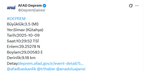 Kütahya’nın Simav ilçesinde saat 10.29’da 3.5 büyüklüğünde deprem kaydedildi. Gece 4.9 büyüklüğünde deprem hissedilmişti. Deprem İzmir’den de hissedilmişti.