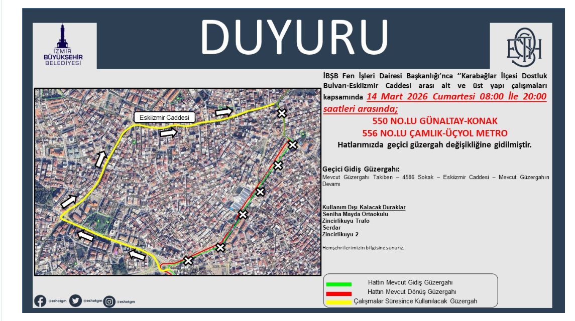 “14 Mart 2026 Cumartesi günü 08.00 - 20.00 saatleri arasında geçerli olmak üzere; İzmir Büyükşehir Belediyesi, Fen İşleri Dairesi Başkanlığı tarafından Karabağlar ilçesi, Dostluk Bulvarı ve Eski İzmir Caddesi arasında yapılan altyapı ve üstyapı çalışmaları nedeniyle 550 No'lu Günaltay - Konak, 556 No'lu Çamlık - Üçyol Metro hatlarımızda geçici güzergah değişikliğine gidilecek olup Seniha Mayda Ortaokulu - Zincirlikuyu Trafo - Serdar - Zincirlikuyu 2 duraklarımız çalışmalar süresince hizmet dışı kalacaktır.”