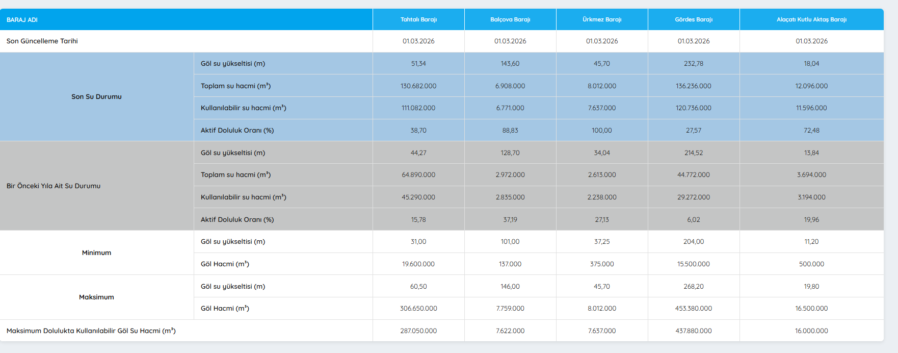 ALAÇATI KUTLU AKTAŞ BARAJI'NIN 1 MART 2026 DOLULUK ORANLARI