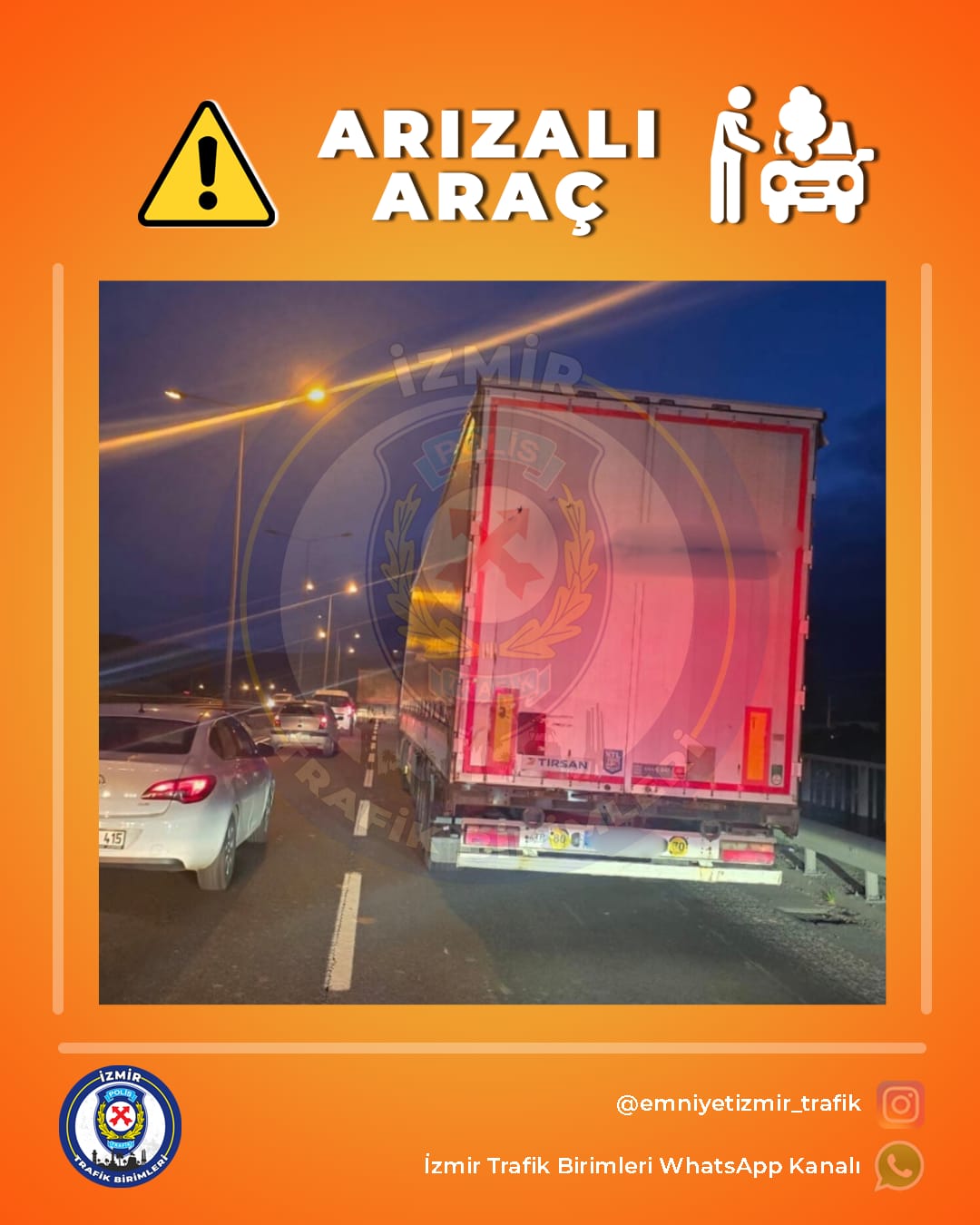 “Ankara Caddesi Kemalpaşa istikametinde, Naldöken Köprüsü üzerinde arıza yapan çekici mevcuttur. Trafik akımının sonu Doğanlar Kavşağı'na ulaşmıştır. Güzergâhtaki sayın yol kullanıcılarının bilgisine sunulur.”