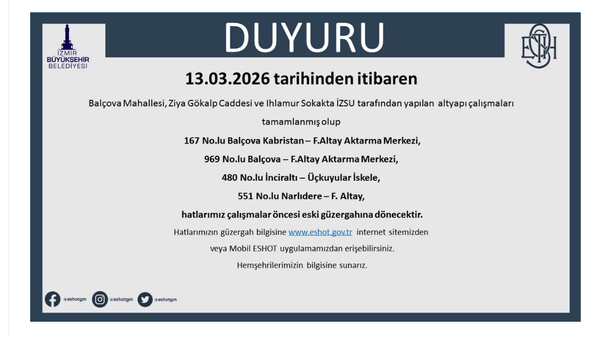 “13.03.2026 tarihinden itibaren Balçova Mahallesi, Ziya Gökalp Caddesi ve Ihlamur Sokakta İZSU tarafından yapılan altyapı çalışmaları tamamlanmış olup 167 No.lu Balçova Kabristan- F.Altay Aktarma Merkezi, 969 No.lu Balçova - F.Altay Aktarma Merkezi, 480 No.lu İnciraltı - Üçkuyular İskele ve 551 No.lu Narlıdere - F. Altay hatlarımız çalışmalar öncesi eski güzergahına dönecektir. Hatlarımızın güzergah bilgisine www.eshot.gov.tr internet sitemizden veya Mobil ESHOT uygulamamızdan erişebilirsiniz. Hemşehrilerimizin bilgisine sunarız.”