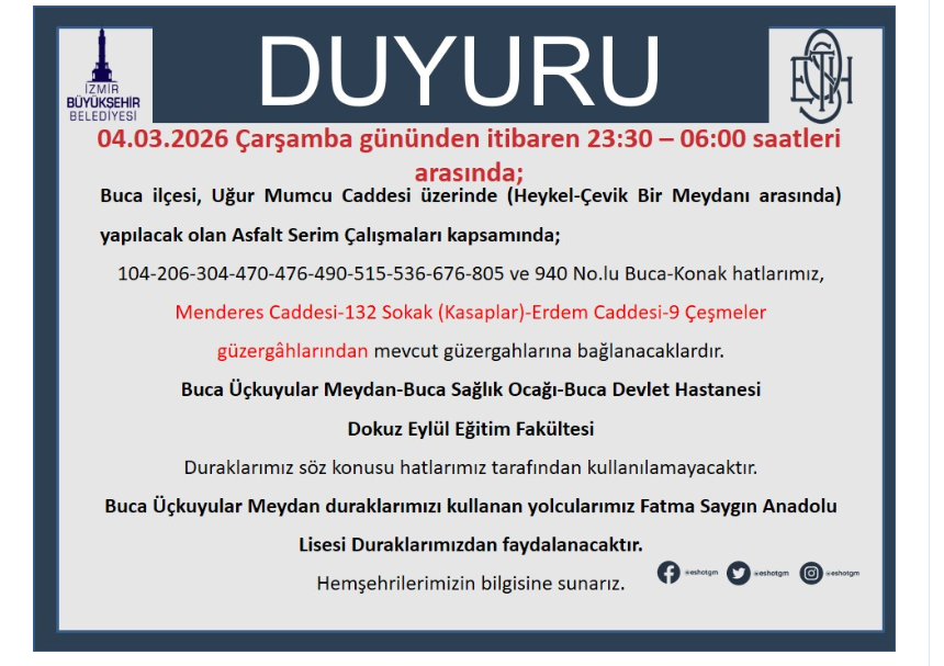 “04.03.2026 Çarşamba gününden itibaren 23:30 - 06:00 saatleri arasında; Buca ilçesi, Uğur Mumcu Caddesi üzerinde (Heykel-Çevik Bir Meydanı arasında) yapılacak olan Asfalt Serim Çalışmaları kapsamında; 104-206-304-470-476-490-515-536-676-805 ve 940 No.lu Buca-Konak hatlarımız, Menderes Caddesi-132 Sokak (Kasaplar)-Erdem Caddesi-9 Çeşmeler güzergâhlarından mevcut güzergahlarına bağlanacaklardır. Buca Üçkuyular Meydan-Buca Sağlık Ocağı-Buca Devlet Hastanesi Dokuz Eylül Eğitim Fakültesi Duraklarımız söz konusu hatlarımız tarafından kullanılamayacaktır. Buca Üçkuyular Meydan duraklarımızı kullanan yolcularımız Fatma Saygın Anadolu Lisesi Duraklarımızdan faydalanacaktır. Hemşehrilerimizin bilgisine sunarız.”