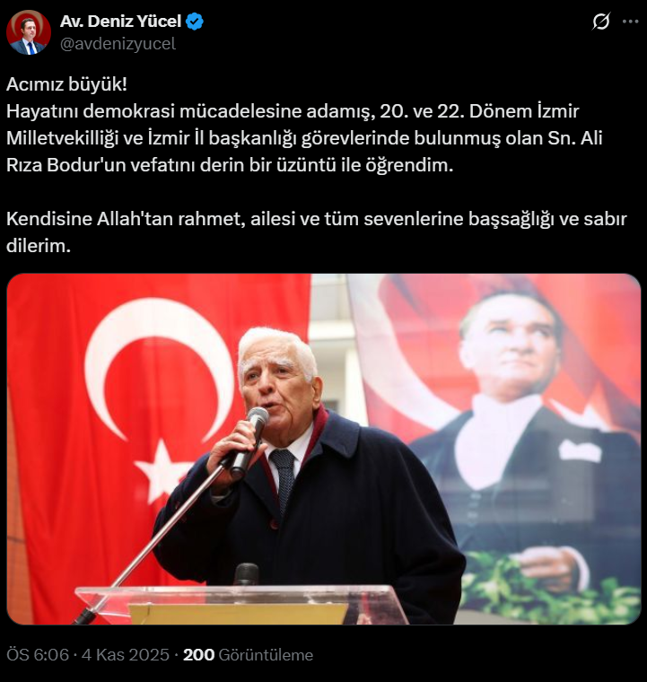 "Acımız büyük! Hayatını demokrasi mücadelesine adamış, 20. ve 22. Dönem İzmir Milletvekilliği ve İzmir İl başkanlığı görevlerinde bulunmuş olan Sn. Ali Rıza Bodur'un vefatını derin bir üzüntü ile öğrendim. Kendisine Allah'tan rahmet, ailesi ve tüm sevenlerine başsağlığı ve sabır dilerim."