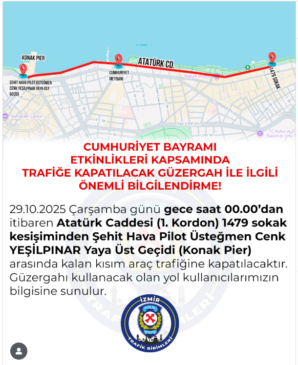 İzmir Emniyet Müdürlüğü tarafından yapılan açıklamaya göre şu ifadeler aktarıldı: “CUMHURİYET BAYRAMI ETKİNLİKLERİ KAPSAMINDA TRAFİĞE KAPATILACAK GÜZERGAH İLE İLGİLİ ÖNEMLİ BİLGİLENDİRME! 29.10.2025 Çarşamba günü gece saat 00.00'dan itibaren Atatürk Caddesi (1. Kordon) 1479 sokak kesişiminden Şehit Hava Pilot Üsteğmen Cenk YEŞİLPINAR Yaya Üst Geçidi (Konak Pier) arasında kalan kısım araç trafiğine kapatılacaktır. Güzergahı kullanacak olan yol kullanıcılarımızın bilgisine sunulur.”