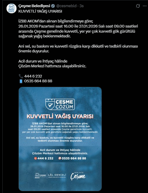 Çeşme Belediyesi tarafından yapılan açıklamada İzBB AKOM’dan alınan bilgilere göre 26 Ocak 2026 Pazartesi günü saat 16.00 ile 27 Ocak 2026 Salı günü saat 09.00 arasında ilçe genelinde kuvvetli, yer yer çok kuvvetli gök gürültülü sağanak yağış beklendiği bildirildi. Açıklamada ani sel, su baskını ve kuvvetli rüzgâr riskine karşı dikkatli olunması gerektiği vurgulandı.