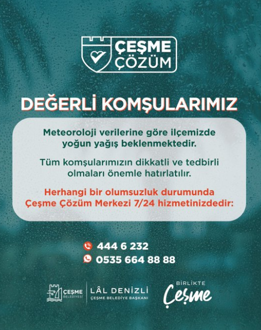 Özellikle sahil bölgelerinde su baskını ve maddi zarar riskine karşı vatandaşlar dikkatli olmalı. Çeşme Belediyesi'nden yapılan açıklamada şu ifadelere yer verildi: “DEĞERLİ KOMŞULARIMIZ Meteoroloji verilerine göre ilçemizde yoğun yağış beklenmektedir. Tüm komşularımızın dikkatli ve tedbirli olmaları önemle hatırlatılır. Herhangi bir olumsuzluk durumunda Çeşme Çözüm Merkezi 7/24 hizmetinizdedir: 444 6 232 ve 0535 664 88 88"
