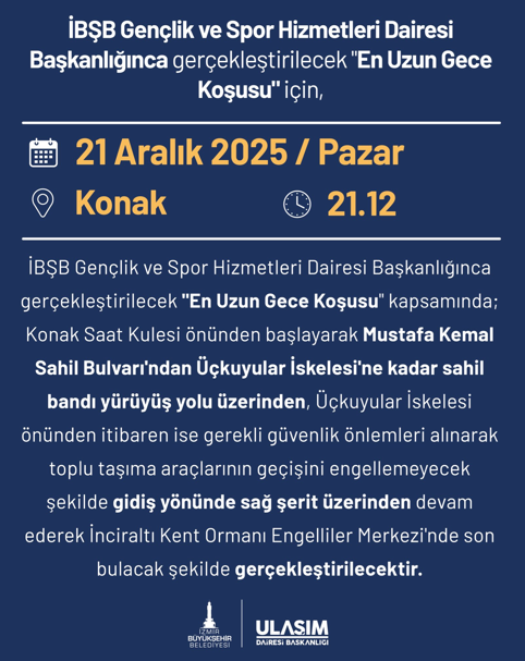 İzmir Büyükşehir Belediyesi Gençlik ve Spor Hizmetleri Dairesi Başkanlığı tarafından gerçekleştirilecek “En Uzun Gece Koşusu”, 21 Aralık 2025 Pazar günü saat 21.12’de Konak Saat Kulesi önünden başlayacak. Etkinlik Mustafa Kemal Sahil Bulvarı üzerinden Üçkuyular İskelesi’ne kadar sahil bandındaki yürüyüş yolu kullanılarak devam edecek. Koşu, Üçkuyular İskelesi önünden itibaren gerekli güvenlik önlemleri alınarak, toplu taşıma araçlarının geçişini engellemeyecek şekilde gidiş yönünde sağ şerit üzerinden sürdürülecek. Organizasyon İnciraltı Kent Ormanı Engelliler Merkezi’nde sona erecek.