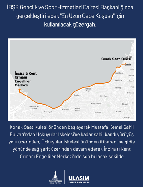 İBŞB Gençlik ve Spor Hizmetleri Dairesi Başkanlığınca gerçekleştirilecek En Uzun Gece Koşusu için kullanılacak güzergah; Konak Saat Kulesi önünden başlayarak Mustafa Kemal Sahil Bulvarı'ndan Üçkuyular İskelesi'ne kadar sahil bandı yürüyüş yolu üzerinden Üçkuyular İskelesi önünden itibaren ise gidiş yönünde sağ şerit üzerinden devam ederek İnciraltı Kent Ormanı Engelliler Merkezi'nde son bulacak şekilde planlandı.