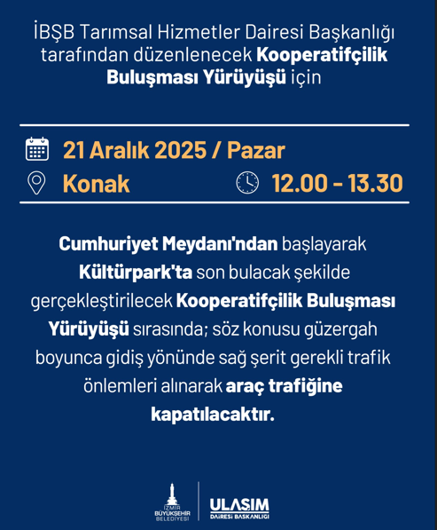 İzmir Büyükşehir Belediyesi’nin açıklamasında konuya dair şu ifadeler yer aldı: “İBŞB Tarımsal Hizmetler Dairesi Başkanlığı tarafından düzenlenecek Kooperatifçilik Buluşması Yürüyüşü için 21 Aralık 2025 / Pazar günü Konak’ta saat 12.00-13.30leri arasında Cumhuriyet Meydanı'ndan başlayarak Kültürpark'ta son bulacak şekilde gerçekleştirilecek Kooperatifçilik Buluşması Yürüyüşü sırasında; söz konusu güzergah boyunca gidiş yönünde sağ şerit gerekli trafik önlemleri alınarak araç trafiğine kapatılacaktır.”