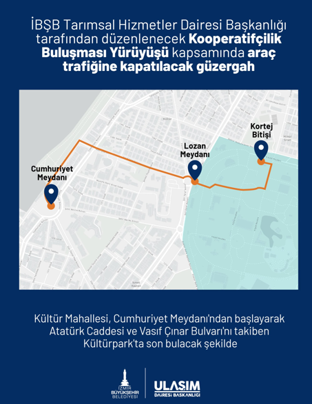 İzmir Büyükşehir Belediyesi Tarımsal Hizmetler Dairesi Başkanlığı tarafından düzenlenecek Kooperatifçilik Buluşması Yürüyüşü ise aynı gün saat 12.00 ile 13.30 arasında gerçekleştirilecek. Yürüyüş Konak’taki Cumhuriyet Meydanı’ndan başlayacak ve Kültürpark’ta sona erecek. Etkinlik süresince yürüyüş güzergahı boyunca gidiş yönündeki sağ şerit, gerekli trafik önlemleri alınarak araç trafiğine kapatılacak.