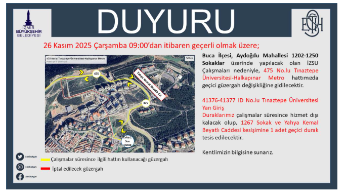 İZSU’nun Aydoğdu Mahallesi 1202-1250 sokaklarındaki çalışmaları nedeniyle 475 numaralı hattın güzergahı geçici olarak değiştirildi. ESHOT’un açıklamasına göre 41376-41377 ID numaralı Tınaztepe Üniversitesi Yan Giriş durakları çalışma süresince hizmet dışı kalacak. İzmir Büyükşehir Belediyesi ESHOT Genel Müdürlüğü tarafından şu ifadeler aktarıldı: “26 Kasım 2025 Çarşamba 09:00'dan itibaren geçerli olmak üzere; Buca İlçesi, Aydoğdu Mahallesi 1202-1250 Sokaklar üzerinde yapılacak olan İZSU Çalışmaları nedeniyle, 475 No.lu Tınaztepe Üniversitesi-Halkapınar Metro hattımızda geçici güzergah değişikliğine gidilecektir. 41376-41377 ID No.lu Tınaztepe Üniversitesi Yan Giriş Duraklarımız çalışmalar süresince hizmet dışı kalacak olup, 1267 Sokak ve Yahya Kemal Beyatlı Caddesi kesişimine 1 adet geçici durak tesis edilecektir.”