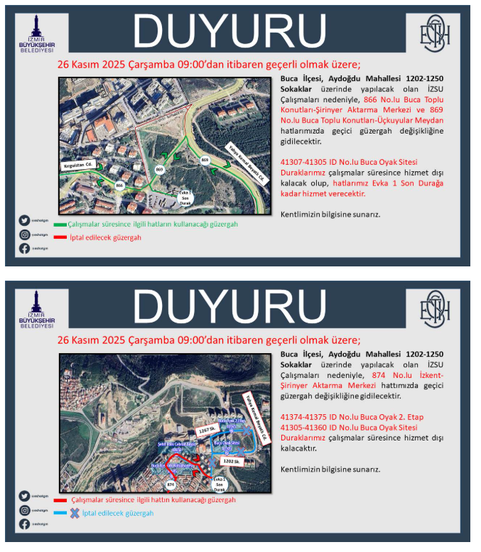 Buca Toplu Konutları–Şirinyer Aktarma Merkezi (866) ve Buca Toplu Konutları–Üçkuyular Meydan (869) hatlarında da çalışma süresince düzenleme yapılacağı duyuruldu. İzmir Büyükşehir Belediyesi ESHOT Genel Müdürlüğü tarafından şu ifadeler aktarıldı: “26 Kasım 2025 Çarşamba 09:00'dan itibaren geçerli olmak üzere; Buca İlçesi, Aydoğdu Mahallesi 1202-1250 Sokaklar üzerinde yapılacak olan İZSU Çalışmaları nedeniyle, 866 No.lu Buca Toplu Konutları-Şirinyer Aktarma Merkezi ve 869 No.lu Buca Toplu Konutları-Üçkuyular Meydan hatlarımızda geçici güzergah değişikliğine gidilecektir.