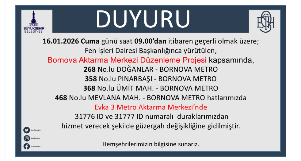 ESHOT Genel Müdürlüğü tarafından gerçekleştirilen açıklamada şu ifadelere yer verildi: “16.01.2026 Cuma günü saat 09.00'dan itibaren geçerli olmak üzere; Fen İşleri Dairesi Başkanlığınca yürütülen, Bornova Aktarma Merkezi Düzenleme Projesi kapsamında, 268 No.lu DOĞANLAR - BORNOVA METRO, 358 No.lu PINARBAŞI - BORNOVA METRO 368 No.lu ÜMİT MAH. - BORNOVA METRO ve 468 No.lu MEVLANA MAH. - BORNOVA METRO hatlarımızda Evka 3 Metro Aktarma Merkezi'nde 31776 ID ve 31777 ID numaralı duraklarımızdan hizmet verecek şekilde güzergah değişikliğine gidilmiştir.”