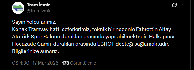 İzmir Tramvayı’nın resmi sosyal medya hesabı Tram İzmir üzerinden yapılan açıklamada seferlerin teknik bir arıza nedeniyle Fahrettin Altay – Atatürk Spor Salonu durakları arasında yapılabileceği belirtildi.Halkapınar – Hocazade Camii durakları arasını kullanmayı planlayan yolcular için ise ESHOT otobüsleri ile ulaşım desteği sağlanacak.