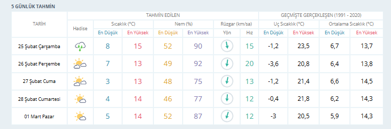 Meteoroloji verilerine göre 25 Şubat Çarşamba günü İzmir’de sağanak yağış bekleniyor ve sıcaklık 15 derece civarında olacak. 26 Şubat Perşembe günü sıcaklık 13 dereceye düşecek ve yağışa ara gelecek. 27 Şubat Cuma günü ise hava parçalı bulutlu olacak ve sıcaklık 13 derece civarında kalacak. İzmir’de hafta sonu 28 Şubat Cumartesi ve 1 Mart Pazar günleri ise hava parçalı bulutlu olacak ve sıcaklıklar 14 derece civarında seyredecek.