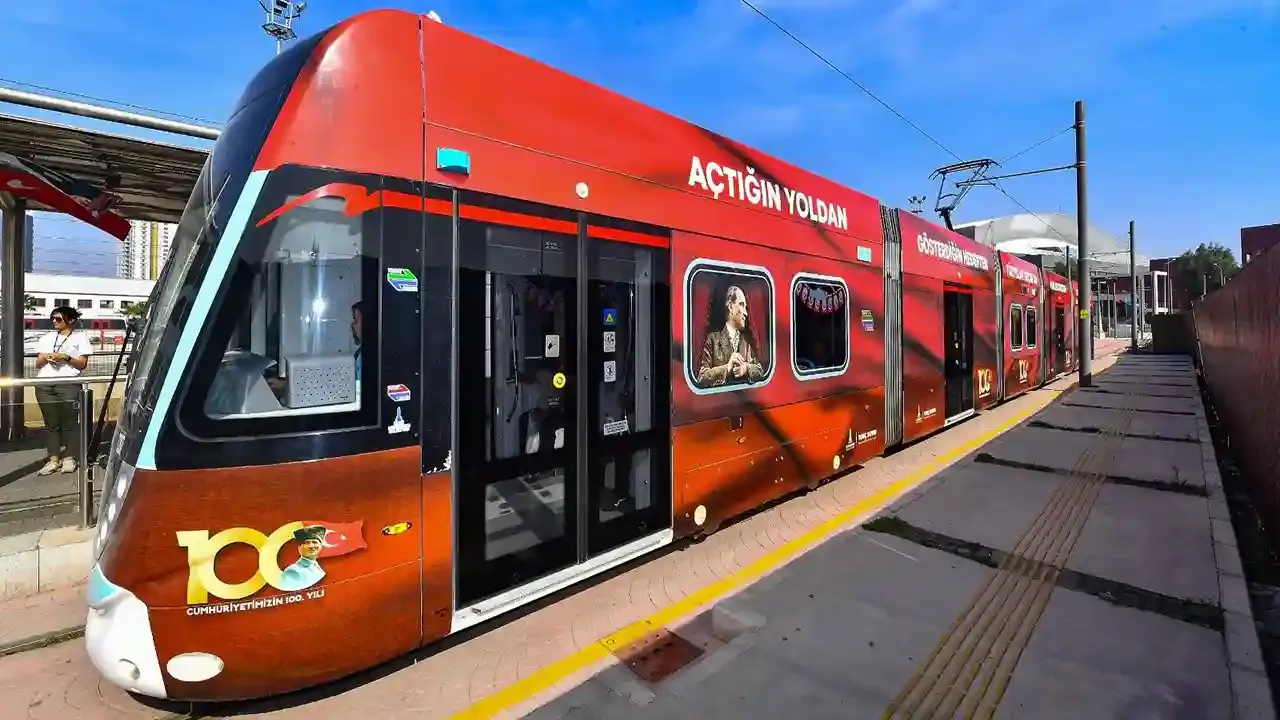 Cumhuriyet’in 100’üncü yıl kutlamaları öncesinde kenti binlerce bayrakla kırmızı beyaz renklere büründüren İzmir Büyükşehir Belediyesi, Fahrettin Altay ile Halkapınar arasında çalışan iki tramvay aracını da 100’üncü yıla yakışır bir şekilde süsledi. İzmirliler, ulu önder Mustafa Kemal Atatürk’ün fotoğrafının da bulunduğu tramvay araçlarına büyük ilgi gösterdi.