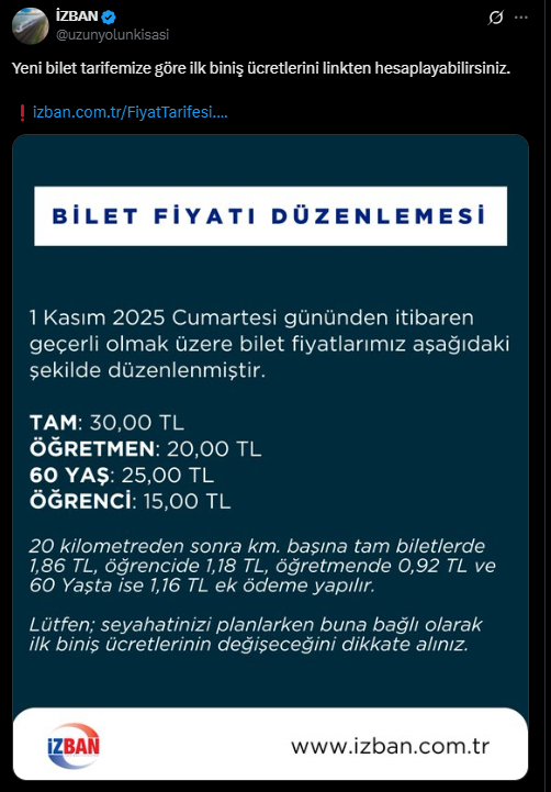 Kasım 2025 İZBAN biniş ücretleri ne kadar oldu?