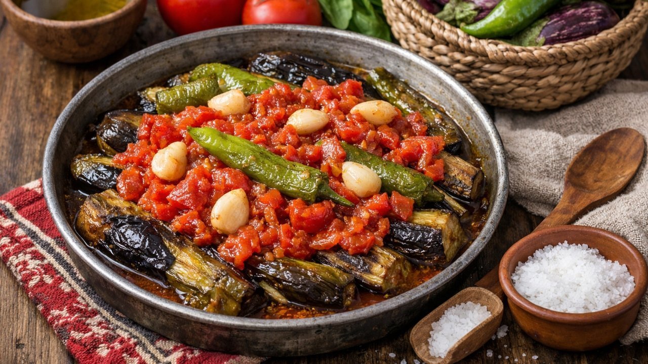 Yemeğin ana malzemeleri arasında patlıcan, köy biberi, domates, sarımsak ve zeytinyağı bulunuyor.